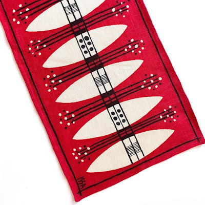 Sportlovsvecka och 1:a mars! Vinteraktiviteter är det tunt med eftersom det knappt kommit någon snö här i AIK-land under januari och februari. Färgchocken sedan i julas har klingat av och mitt förhållande till kulören är normaliserat. Då slår jag till med en linnelöpare, 22*56, med ett modernt och stiliserat formspråk av Issa Feuk från 1950-talet. Som vanligt skenar min fantasi iväg mot kärnor, frön, baljväxter eller kanoter! Man skulle kanske peta ner några torkade gula ärtor i en kruka ... och vips har man skira ärtskott på mackorna om ett par dagar. Sagt och nästan gjort ... adjö! 🌱🌱🌱